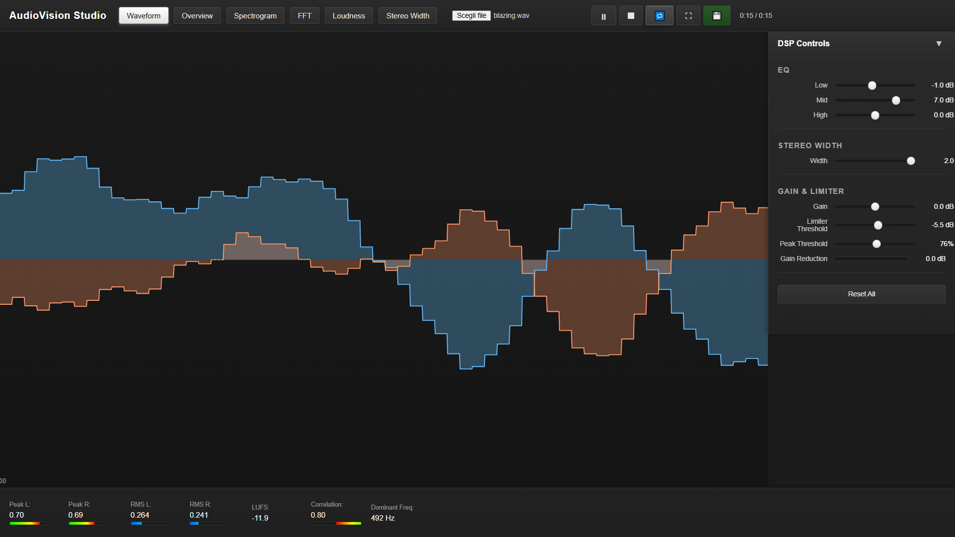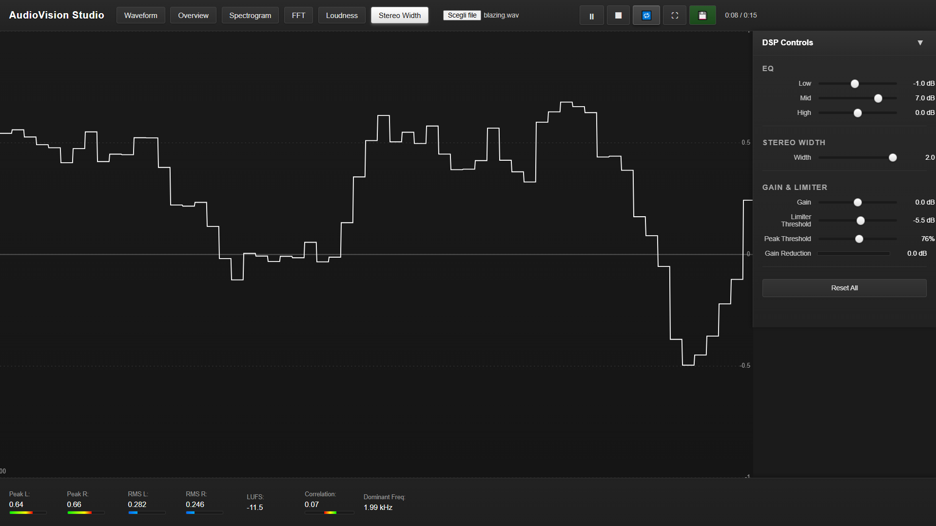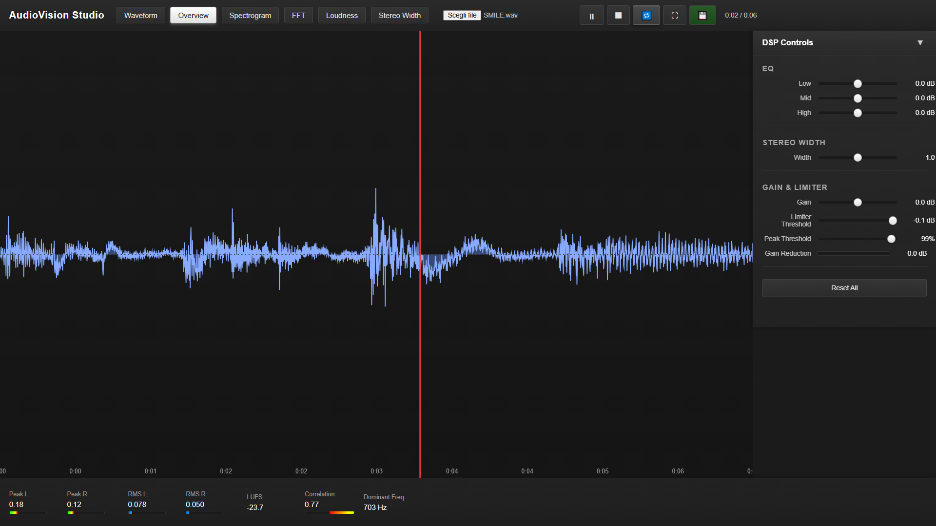 AudioVision Studio brings together visualization, analysis, and processing for audio professionals and advanced producers. Built with Web Audio API and Electron, it delivers real-time performance and a modern, distraction-free interface.