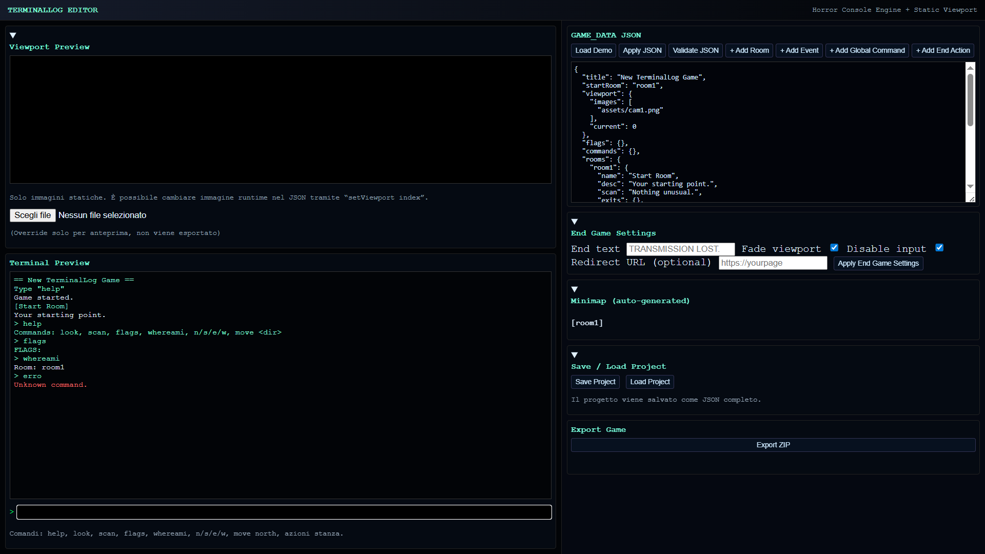 Terminal Micro Engine is a compact HTML/JS micro-engine for building retro terminal narrative games with an optional animated viewport (static image or tileset). Fully JSON-driven, no JavaScript required.